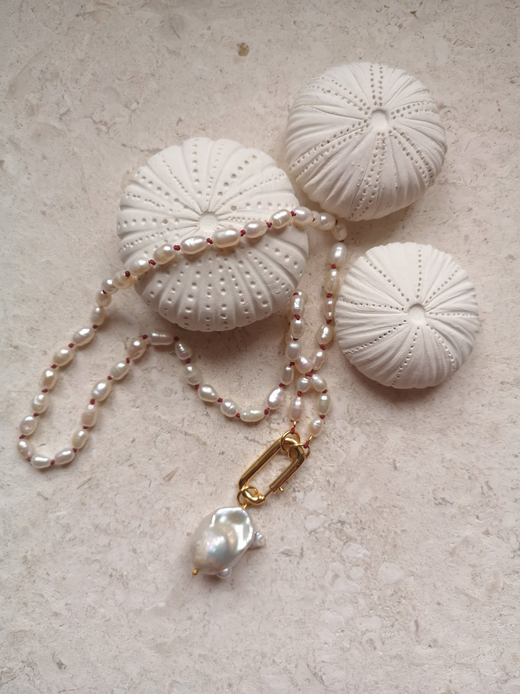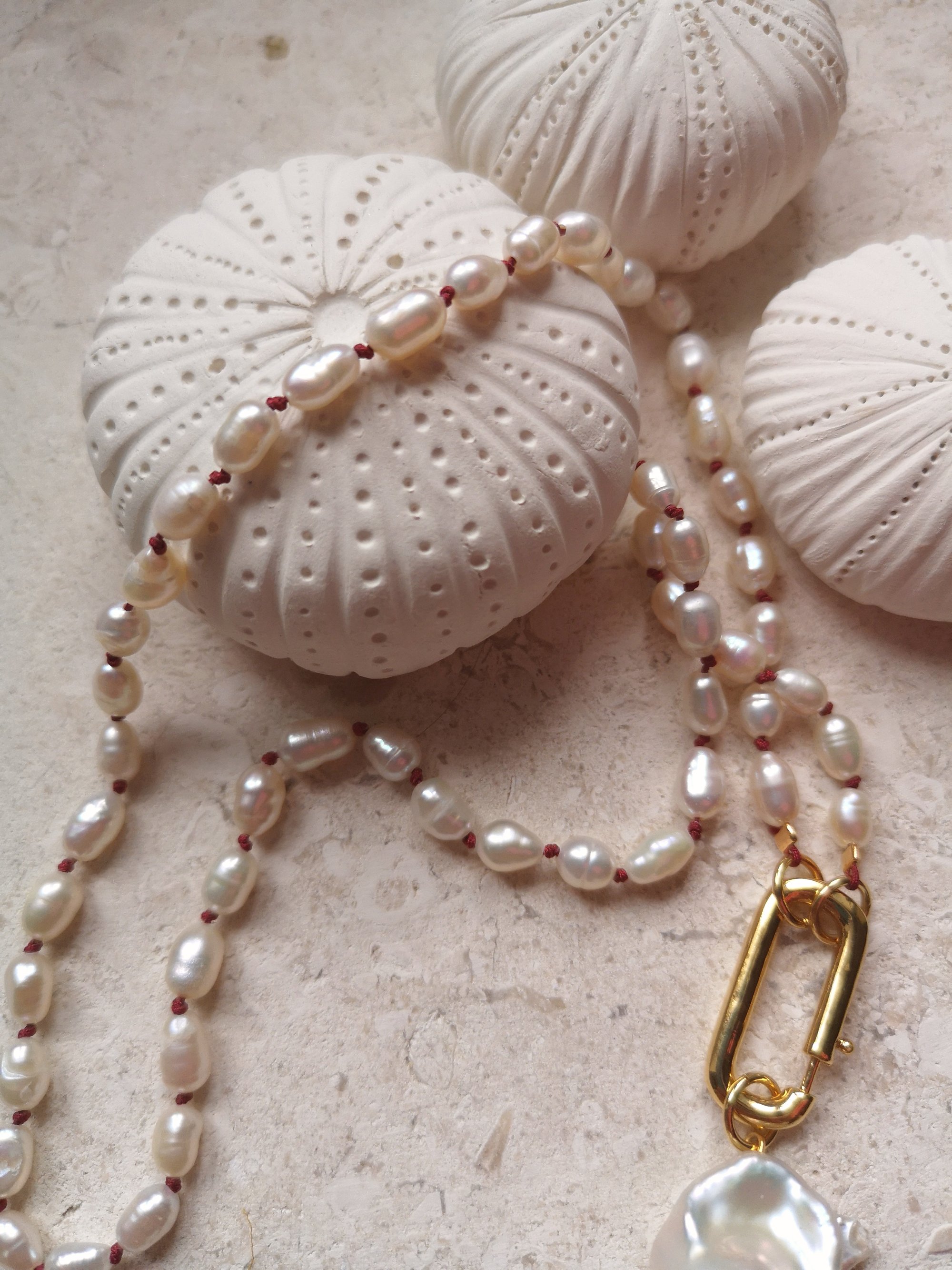Matières ~ Plaqué or, fil coloris rouge, perles d'eau