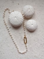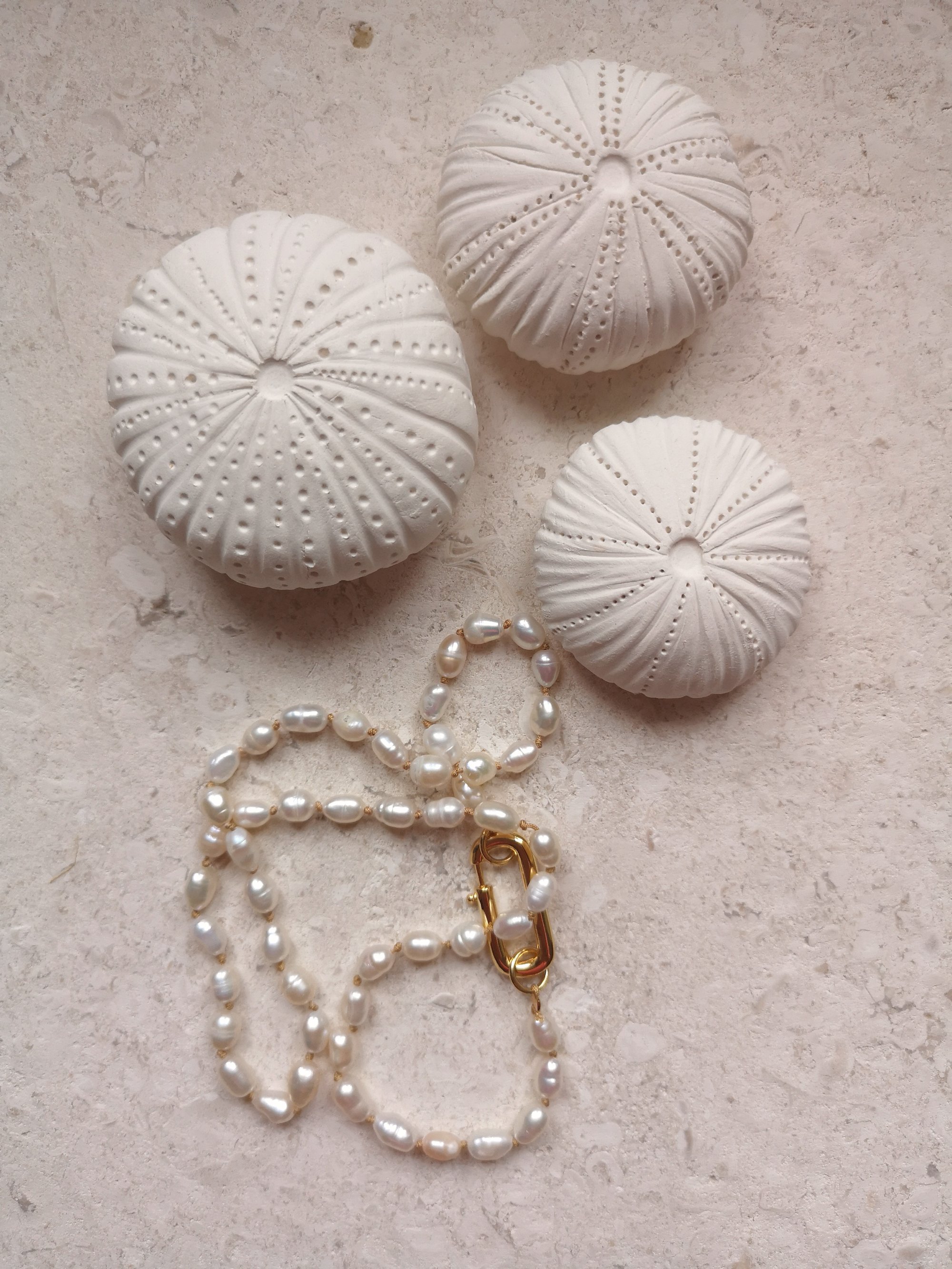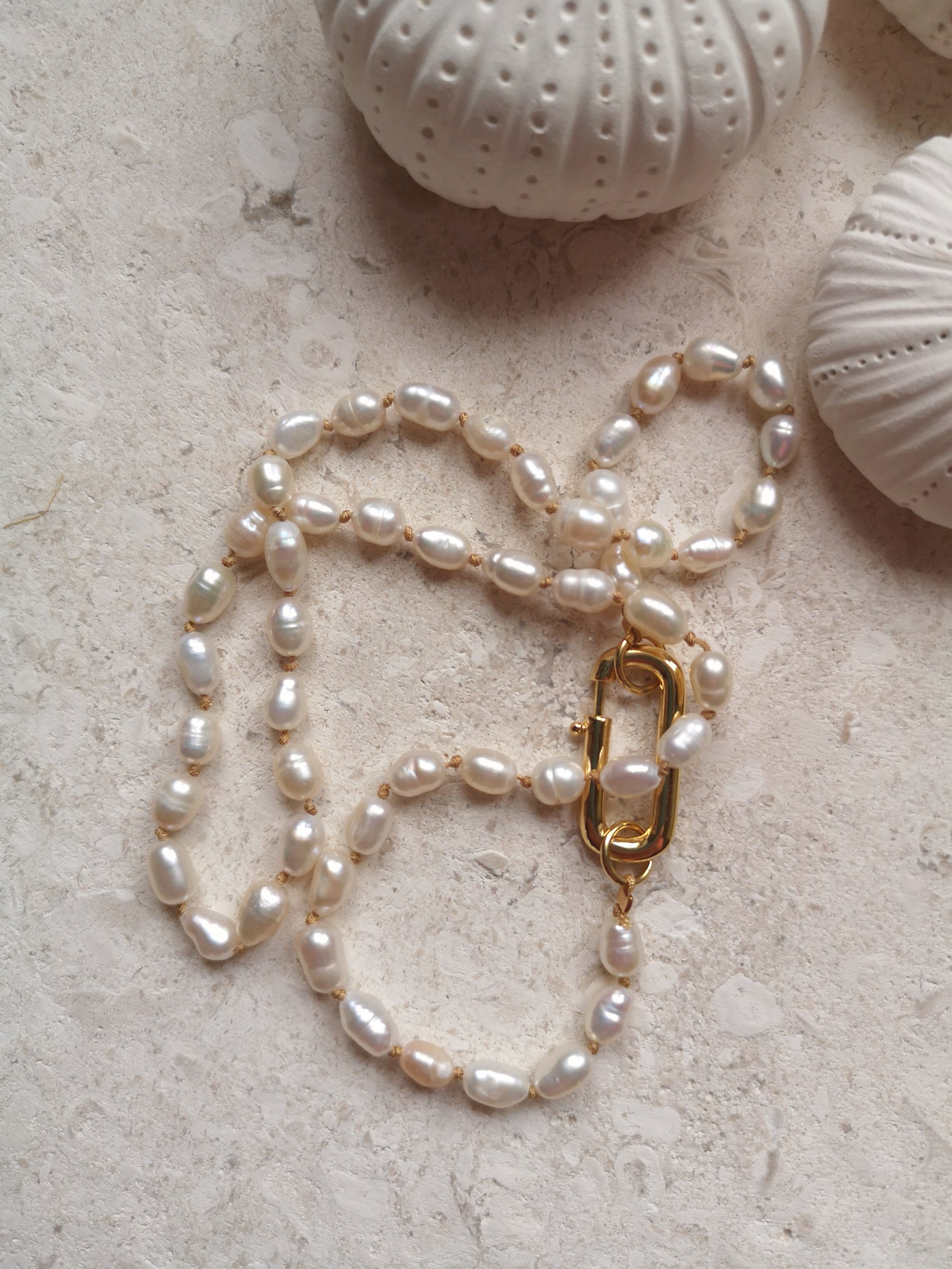 Matières ~ Plaqué or, fil coloris beige, perles d'eau